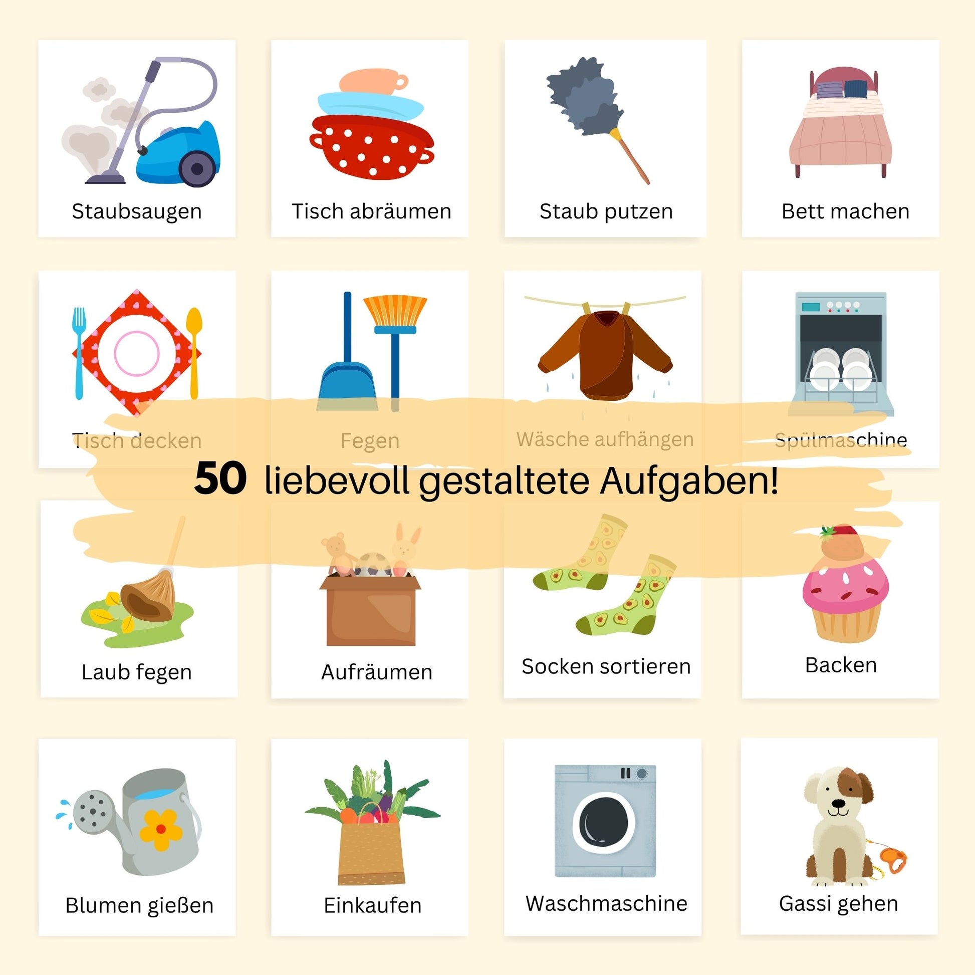 Zimmer aufräumen, Staubsaugen, Fegen, Wischen, Staub putzen, Bett machen, Tisch abräumen, Abtrocknen, Tisch decken, Spülen, Kochen, Backen, Wäsche aufhängen, Wäsche abnehmen, Wäsche falten, Toilette reinigen, Aufräumen, Treppe kehren, Laub fegen, Socken sortieren, Schmutzwäsche in Wäschekorb, Wäsche in Kleiderschrank, Handtücher wechseln, Wohnzimmer aufräumen, Waschbecken putzen, Bettwäsche wechseln, Gemüse schälen & schneiden, Badezimmer aufräumen, Fenster putzen, Draußen kehren, Einkäufe einräumen, Gassi gehen, Rasen mähen, Auto reinigen, Gartenarbeit, Briefkasten leeren, Kleiner Einkauf, Schuhe putzen, Blumen gießen, Trockner, Waschmaschine, Müll rausbringen, Haustiere füttern, Haustierkäfig reinigen, Schreibtisch aufräumen, Spülmaschine einräumen, Spülmaschine ausräumen, Frühstück vorbereiten, Mittagessen vorbereiten, Abendessen vorbereiten